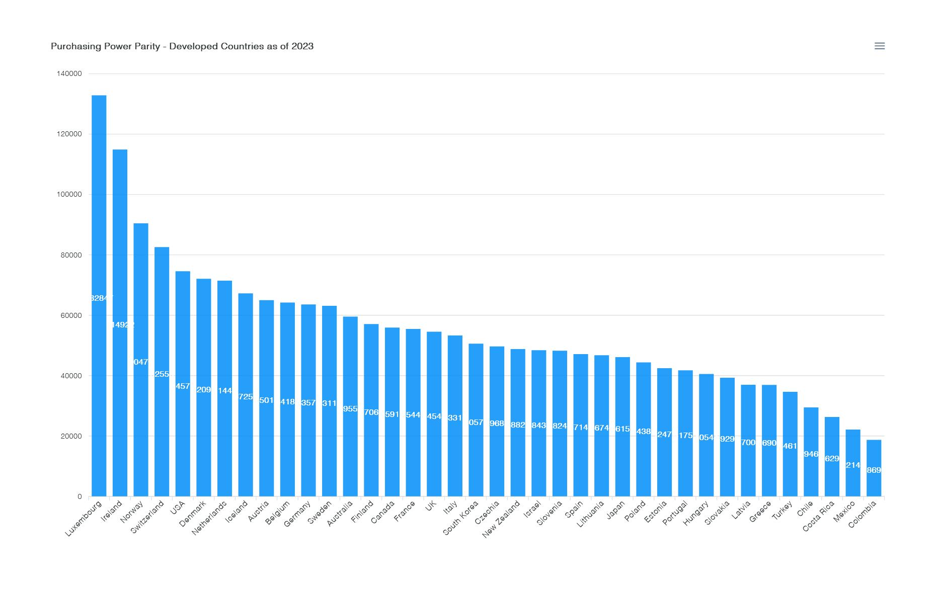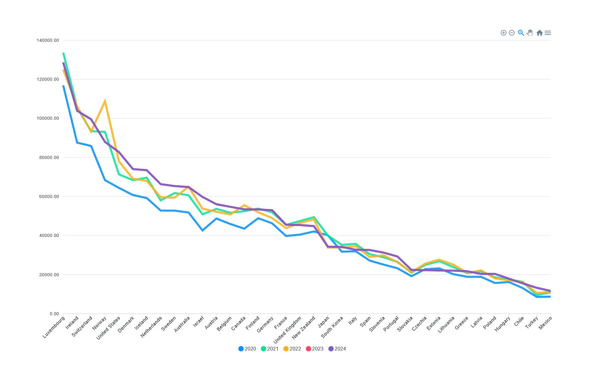 GDP Per Capita Over Time – Developed Countries 2020 to 2024